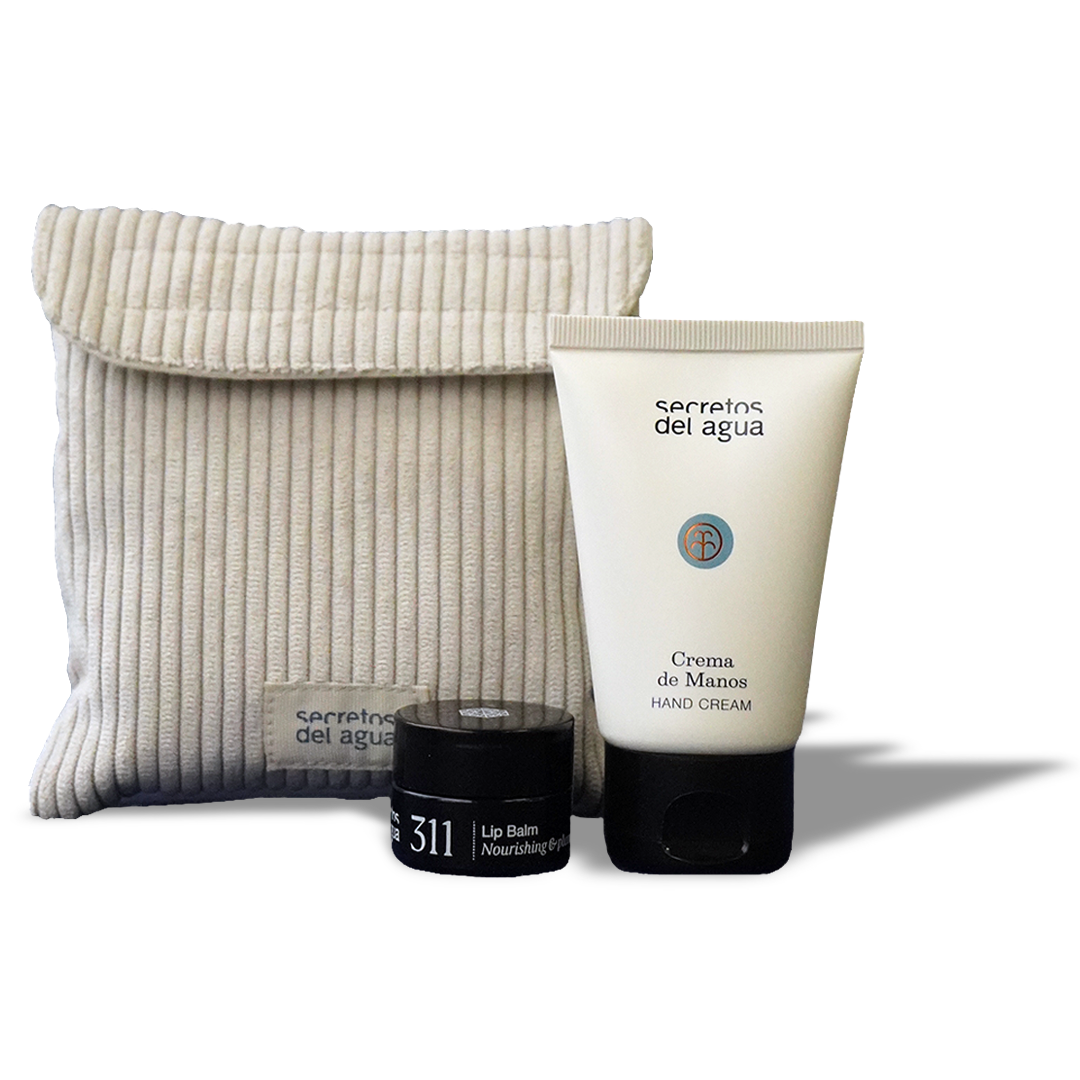El Neceser Dúo Manos y Labios es un conjunto diseñado para nutrir y proteger, ofreciendo un cuidado diario equilibrado a las manos y los labios, dos gestos esenciales de conexión con el mundo. Incluye un bálsamo labial voluminizador que hidrata profundamente y aporta un sutil toque de volumen, manteniendo los labios suaves y embellecidos, y una crema de manos con propiedades antiaging y despigmentantes que nutre, repara y deja una suavidad incomparable. Todo ello presentado en un neceser artesanal fabricado en España, certificado con Oeko-Tex, que refleja la esencia sostenible y consciente de Secretos del Agua.