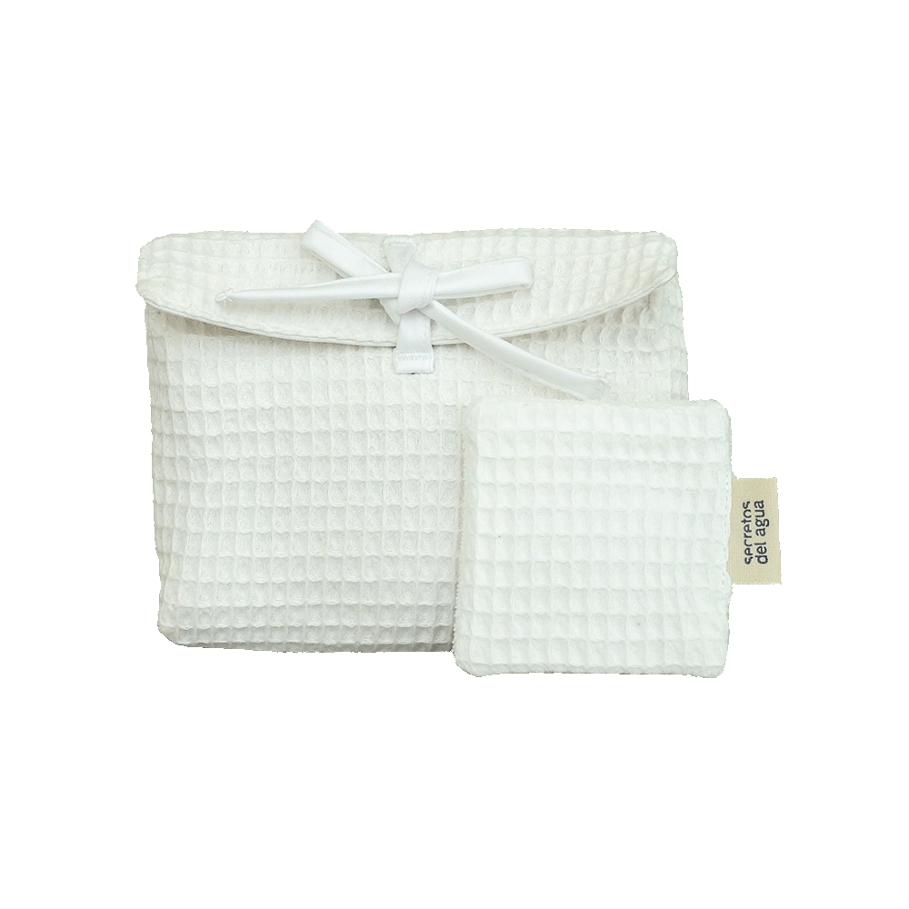 – Neceser artesanal: Confeccionado en algodón gofrado con entretela interior que aporta cuerpo y un forro impermeable que protege el interior.